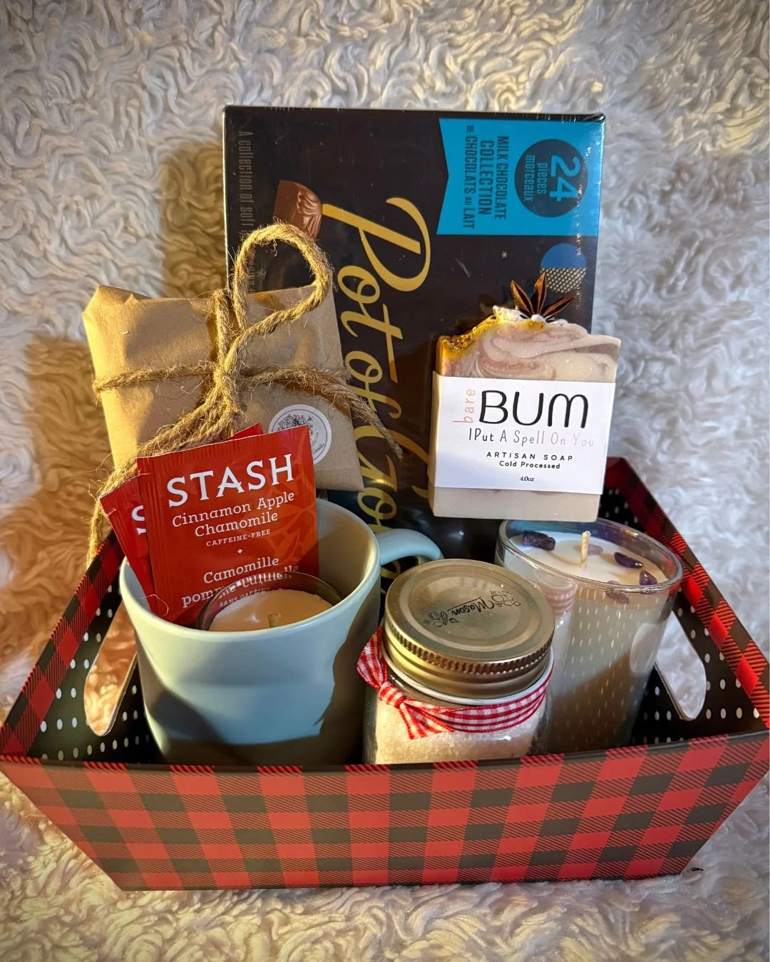 These baskets include an 8oz and 4oz soy candle along with a pack of 4 tea light candles. Alongside a bar of hand made cold pressed soap from Bare Bum Artisan Soaps, I have made up a batch of bath salts with essential oils to help you unwind . Warm up with a cute mug and some tea. Plus a couple sweet treats, including a home made cake pop from Sunny Slope Farm Stand (not shown). Great as Valentine’s presents!